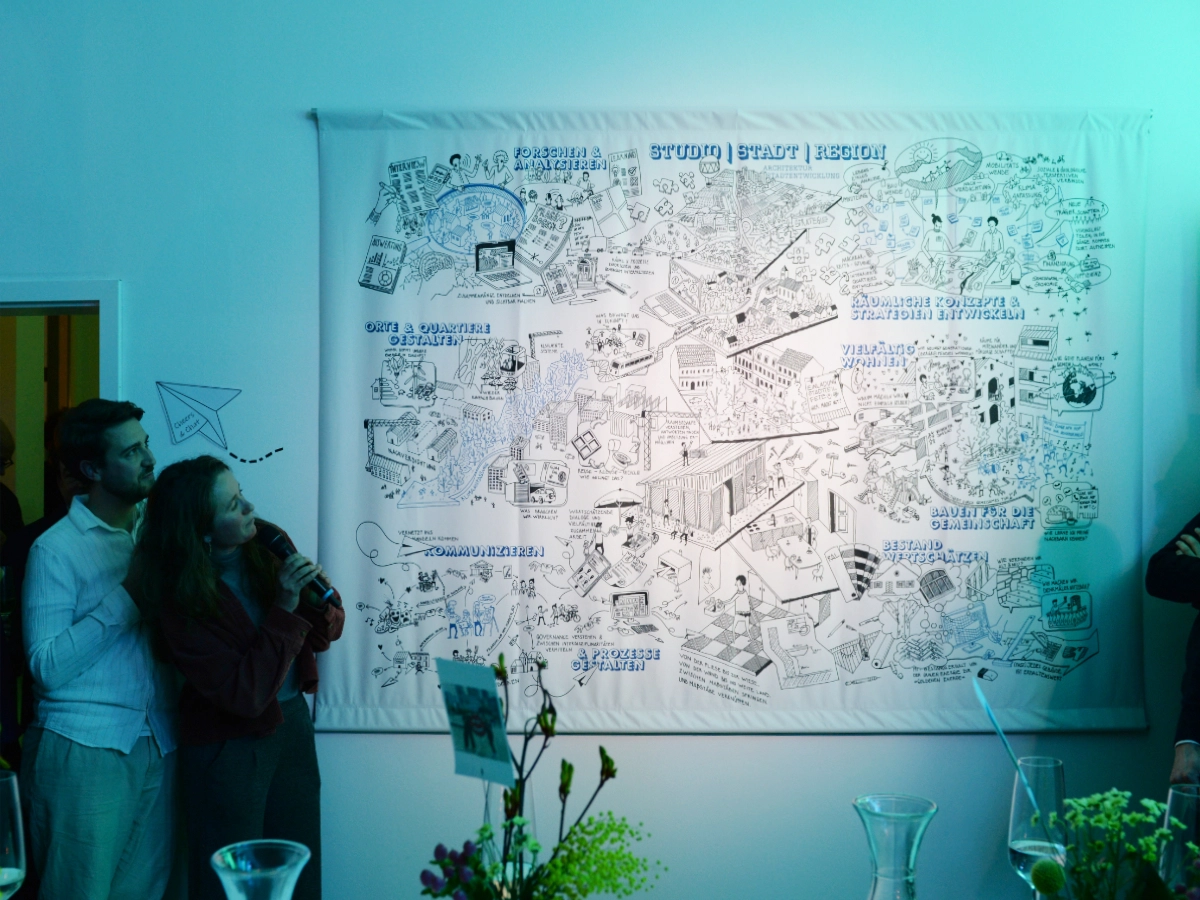 Danke für zehn Jahre gemeinsames Gestalten, Zusammenarbeit und Vertrauen. Bei Speis, Trank und Musik wurde der Abend in unseren frisch umgestalteten Büroräumen genossen. Im Rahmen unserer Ausstellung blickten wir zurück auf das bereits Entstandene und Momente, die wir mit Ihnen und Euch erlebt haben. Höhepunkt des Abends war die Enthüllung der Zukunftsgrafik, mit der wir den Blick nach vorne wagen und unsere Gesamtvision und Arbeits- und Forschungsfelder darstellen.
