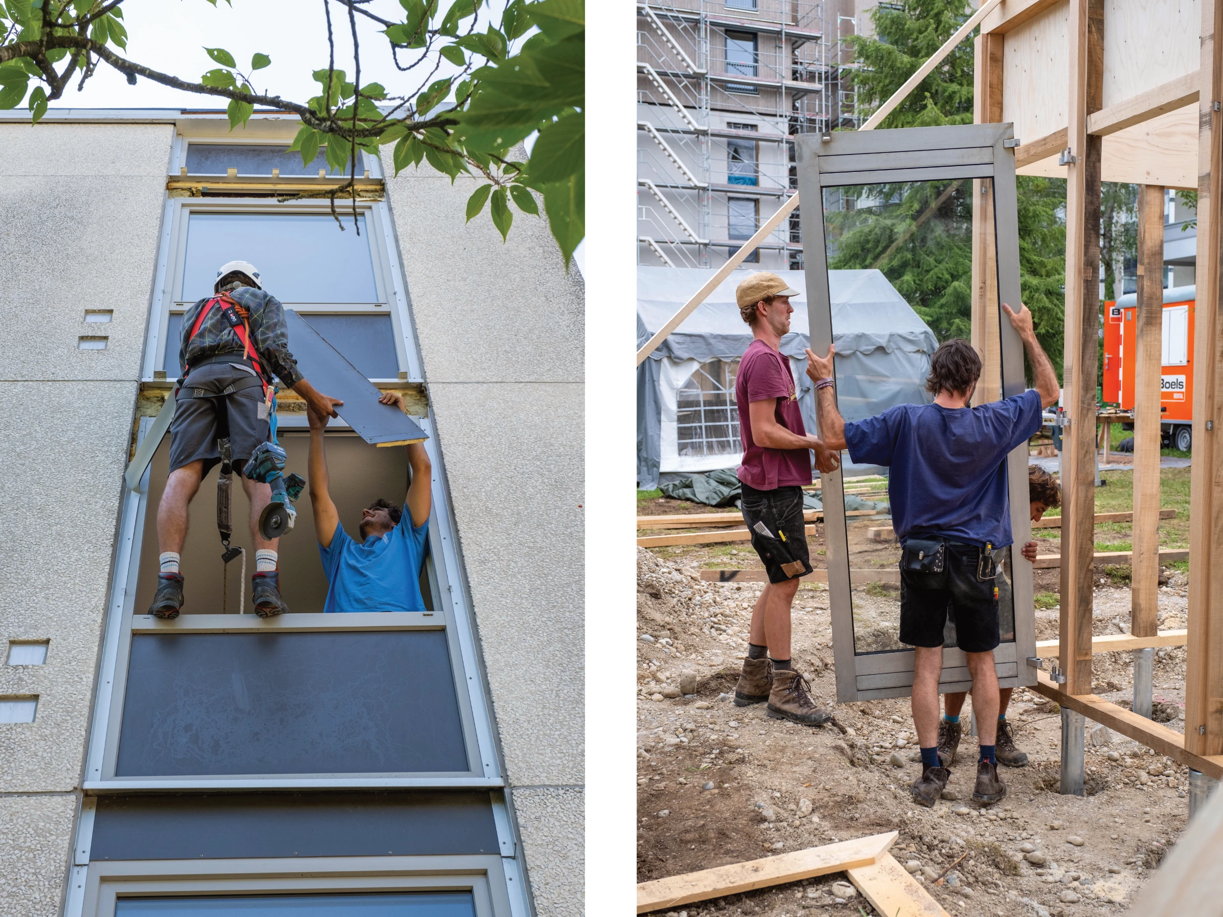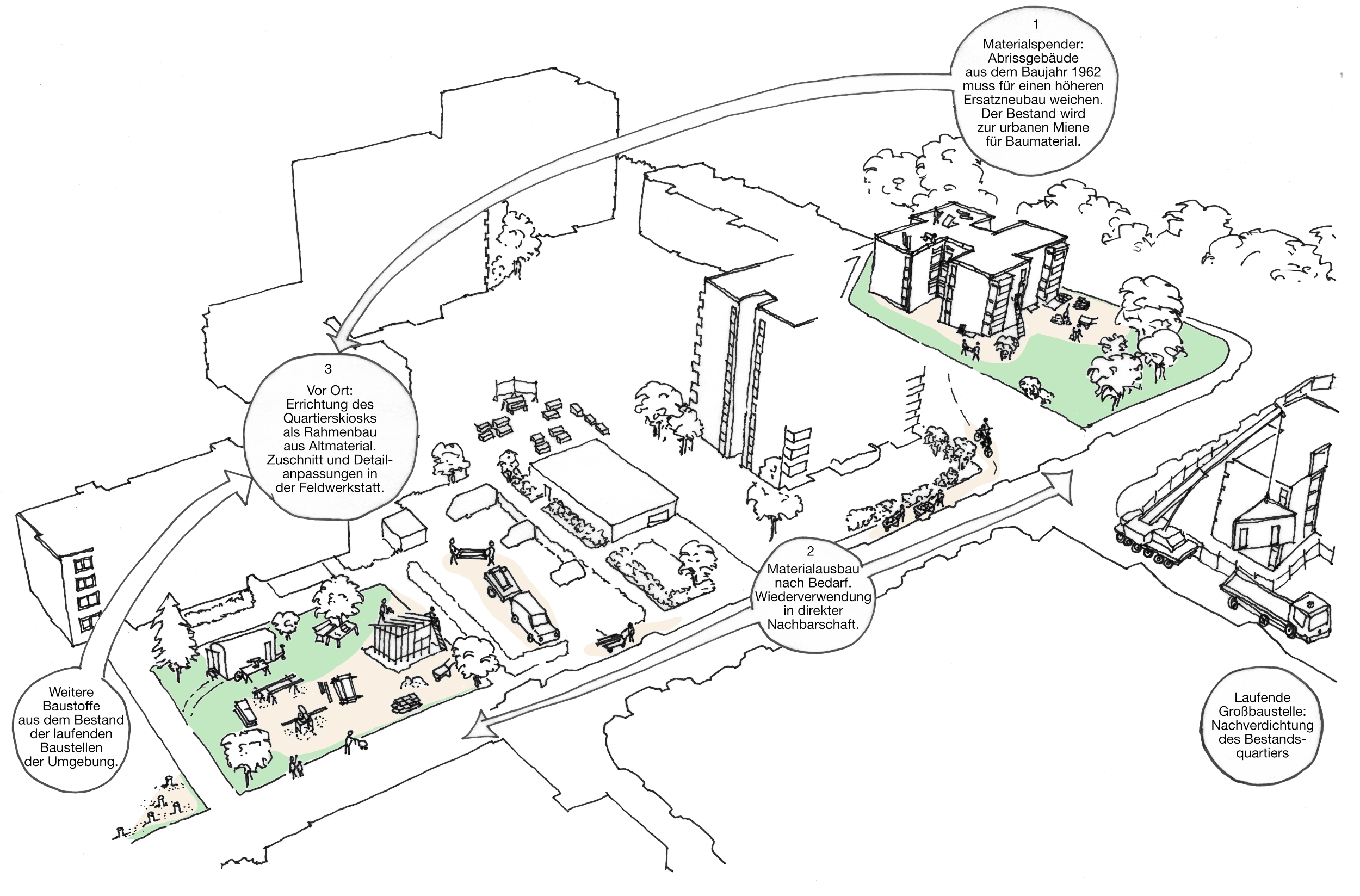 Der Erfolg des Projekts beruht vor allem auf der Zusammenarbeit mit dem Kollektiv Belwerk und der Zimmerei Plan B, die sich auf unser experimentelles Vorgehen einließen und die Umsetzung möglich machten. Aufbauend auf unserem Entwurf für den Kiosk, der aus der Sichtung recycelter Materialien entstanden war und der gemeinsamen Begehung der Materialquellen, entwickelten die Zimmerer des Kollektivs Belwerk die Werk- und Detailplanung. Aus dem 200m entfernten Abrissgebäude wurden all jene Materialien ausgebaut, die für den Kioskbau direkt wieder - wenn auch in neuer Funktion und Fügung - eingebaut wurden. Die Balken für die Tragstruktur stammen aus lokal zugeschnittenem Holz von Bäumen, die ein Jahr zuvor im Zuge eines Tiefgaragenbaus gefällt wurden. Auf Pfahlgründungen montiert, übernehmen die Frischholzbalken nicht nur die Tragfunktion, sondern bilden – durch das Geschick der Zimmerer – zugleich die Rahmen der schweren Aluminium-Fenstertüren. Für die Dachdeckung kommen wiederverwendete Attikableche zum Einsatz, alte Fenster und Türen werden integriert, und eine ehemalige Treppenhausbrüstung dient heute als Theke. In der Zusammenarbeit entsteht ein Pavillonbau aus Recyclingmaterialien, der eine gestalterische und materielle Hochwertigkeit zeigt, die mit Neumaterial im vorhandenen Budget kaum möglich wäre.