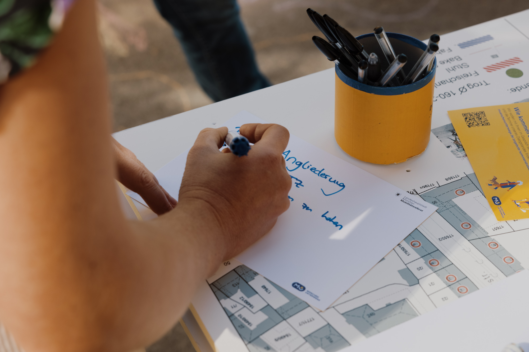 Seit 2021 begleiten wir die Kommunikation der Sommerstraßen und entwickeln das Projekt Schritt für Schritt weiter. Begonnen haben wir klein: Digitale Informationsveranstaltungen vorab, um frühzeitig Rückmeldungen und Anliegen von Nachbarschaft zur geplanten Sommerstraße einzuholen. Gleichzeitig waren wir von Anfang an während der Sommermonate mit unserem mobilen Dialogstand vor Ort, hörten zu, sammelten Eindrücke und dokumentierten weitere Anliegen direkt im Straßenraum.